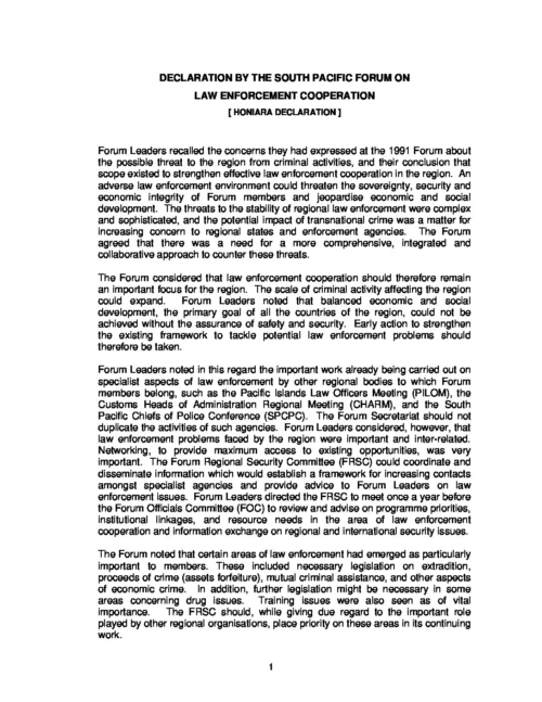 Forum Leaders recalled the concerns they had expressed at the 1991 Forum about the possible threat to the region from criminal activities, and their conclusion that scope existed to strengthen effective law enforcement cooperation in the region. An adverse law enforcement environment could threaten the sovereignty, security and economic integrity of Forum members and jeopardise economic and social development. The threats to the stability of regional law enforcement were complex and sophisticated, and the potential impact of transnational crime was a matter for increasing concern to regional states and enforcement agencies.